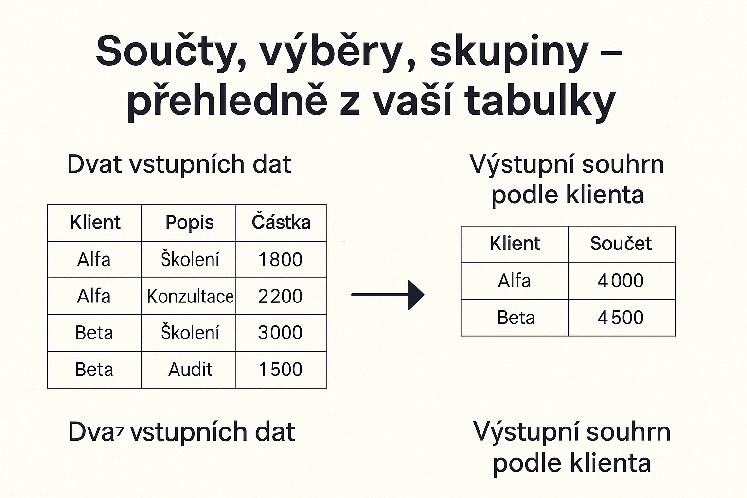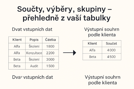Připravím součty, výběry podle podmínek, rozdělení do skupin nebo doplnění nových údajů. Pracuji i s transakčními daty – jasně, přehledně, bez zbytečných složitostí.